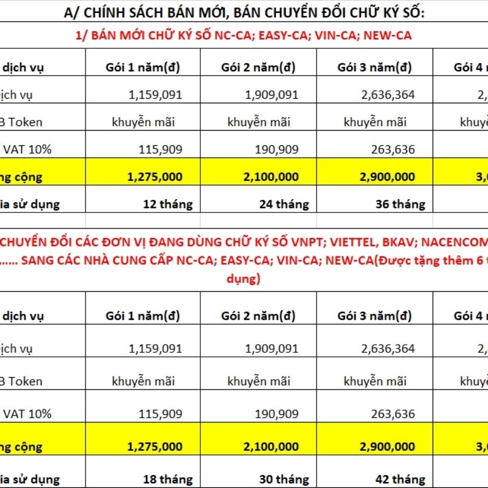 Chữ ký số Doanh nghiệp nhiều mức giá của nhiều gói